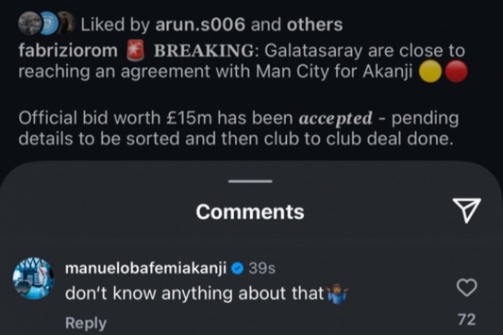 阿坎吉出現在羅馬諾的ins評論區,他評論道:我什么都不知道。