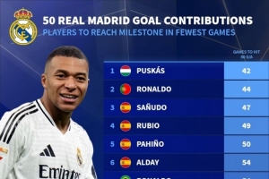 體育資訊8月21日訊 德國轉會市場統計了皇馬球員參與50粒進球所需的場次,并列出最快參與50球榜單,普斯卡什42場居首,C羅44場次席,姆巴佩60場排名第13位。