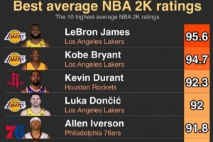 體育資訊8月23日訊 今日美媒HoopsHype曬出NBA球員2K歷史平均評分最高的10位球員,具體如下: