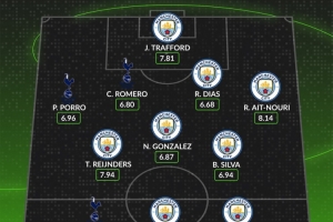 WhoScored根據(jù)球員上賽季至今的場(chǎng)均評(píng)分列出了曼城+熱刺陣容,哈蘭德、庫(kù)杜斯在列,熱刺僅3人入選。