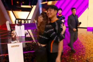 Xiaohai在臺上捧杯后,孩嫂登臺,Xiaohai緊緊擁抱住了妻子。