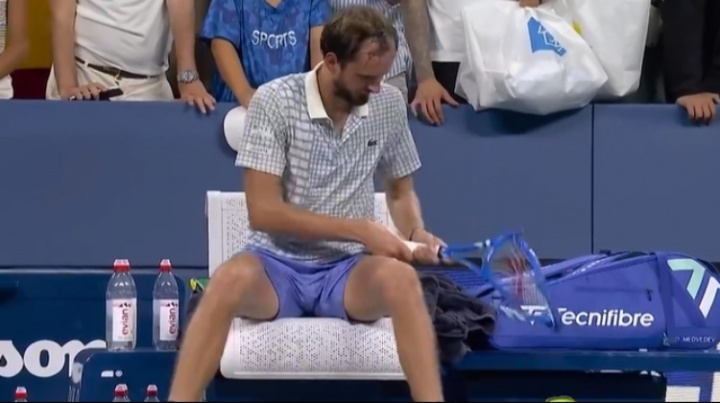 賽后梅德韋杰夫怒砸球拍,砸了個稀巴爛。這是他又一次大滿貫一輪游,今年法網、溫網、美網他均遭一輪游。