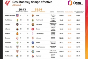 體育資訊8月26日訊 Opta統(tǒng)計了西甲第二輪的凈比賽時間,馬競vs埃爾切凈比賽時間63分09秒最長,皇家奧維耶多vs皇馬、萊萬特vs巴薩二三位。