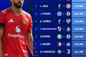 體育資訊8月26日訊 轉會市場盤點了今年夏窗截至目前南美球員轉會費榜單,其中庫尼亞居首,迪亞斯次席,具體榜單如下: