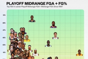 體育資訊8月27日訊 今日,數據媒體NBA University曬出一張自從1997年以來聯盟季后賽中距離投籃出手次數前100球員的命中率分布圖。
