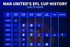 最近十年,曼聯曾在16-17賽季以及22-23賽季獲得該項賽事冠軍,此前最差戰績是18-19賽季第三輪不敵德比郡,21-22賽季第三輪不敵西漢姆。