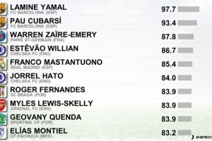 體育資訊8月28日訊 CIES(瑞士足球天文臺)評出今年非門將U20球員的表現,亞馬爾成為評分最高的球員,庫巴西第二。