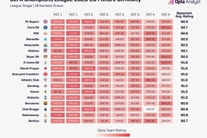 Opta使用個球隊的實力排名體系進行分析(該體系將全球1.3萬支球隊納入同一評估標準進行排名,得分越高的球隊實力越強),對每支歐冠參賽隊的8個對手取平均分,算出來數值越高的證明對應的賽程越困難, 結果1-18名的排名如下: