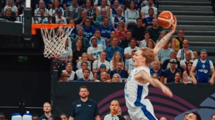 第四節比賽中,芬蘭18歲小將米卡-穆里寧貢獻一記帥氣扣籃——當時穆里寧在防守回合帽掉對手,隨后馬上快下,接應隊友的長傳球,騰空來了一個舒展的滑翔單臂暴扣。