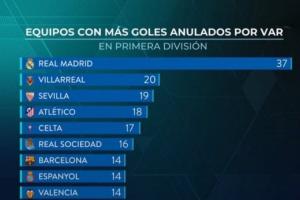 賽后皇馬官方電臺曬出圖標,統計西甲被VAR取消的進球排名,其中皇馬有37球被VAR取消,大幅領先排名第二的比利亞雷亞爾。