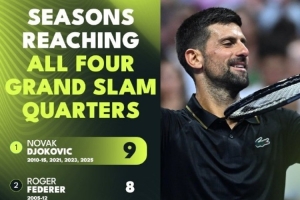 本賽季四大滿貫,德約科維奇全部打進8強,他單賽季9次四大滿貫均至少晉級八強,超越費德勒,成為歷史第一。