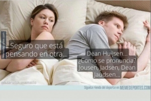 赫伊森貼出的圖片中有一對情侶,其中那個男的顯然是一個西班牙球迷,他糾結于赫伊森名字的發音(注:赫伊森是小時候從荷蘭移居到西班牙的,他這個姓氏在西班牙很罕見,而荷蘭語和西班牙語的發音有很大差別):“這個名字該怎么念呢?豪森,哈德森,丹-華森...", 他身旁的女友懷疑他有外遇了:“他肯定在想別的女孩..."