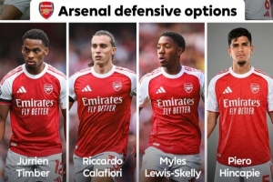 英超官方曬阿森納防線陣容,八名球員在列:薩利巴、莫斯克拉、本-懷特、加布里埃爾、廷伯、卡拉菲奧里、斯凱利、因卡皮耶。