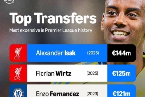 體育資訊9月2日訊 利物浦已經官宣簽下伊薩克。數據統計顯示,英超歷史最貴轉會前6名均發生在最近4年,而紅軍在今夏兩次刷新了英超歷史標王紀錄。