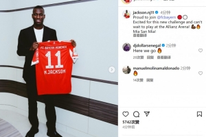 杰克遜曬出手拿拜仁11號(hào)球衣的照片,并寫(xiě)道:“很自豪能加盟拜仁,對(duì)這個(gè)新挑戰(zhàn)感到興奮,迫不及待想要在安聯(lián)球場(chǎng)踢球了!Mia San Mia!!”