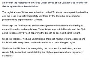 奧多的注冊在截止時間后一分鐘提交給EFL,由于格林斯比的電腦問題,俱樂部未能立即發(fā)現(xiàn)該問題。我們接受所施加的罰款,并完全認識到遵守比賽規(guī)則和規(guī)定的重要性。這一錯誤并非故意,俱樂部在發(fā)現(xiàn)違規(guī)后立即主動報告。