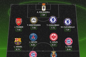 中場:亞馬爾(巴薩,8.74分)、若奧-內維斯(巴黎,8.20分)、詹-烏尊(法蘭克福,8.14分)、路易斯-迪亞斯(拜仁,8.46分)