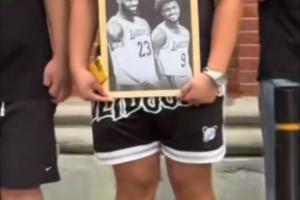 有網友曬出視頻,視頻中有球迷拿著詹姆斯和布朗尼的黑白合照在外灘駐足等待。