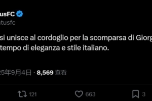 尤文官方寫道:“尤文圖斯俱樂部對喬治-阿瑪尼的逝世表示哀悼,他是意大利優(yōu)雅與風(fēng)格的永恒象征。”