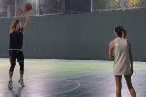 付豪配文寫道:“美好的一切。”視頻中,付豪在練習(xí)投籃,其妻子幫他撿球。
