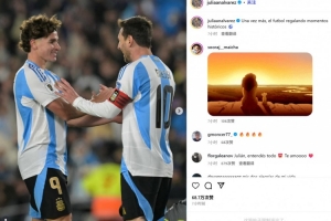 阿爾瓦雷斯在賽后也曬出他和梅西的慶祝照,并配文:“又一次,足球奉上了歷史性時刻。”