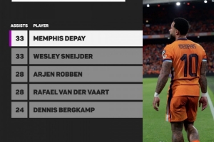 數據統計顯示,自1978年世界杯以來,德佩是荷蘭隊助攻數并列最多的球員。