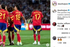 赫伊森社媒曬出比賽照片,配文:“開啟世預賽征程的重要三分,讓我們繼續努力,加油西班牙!”