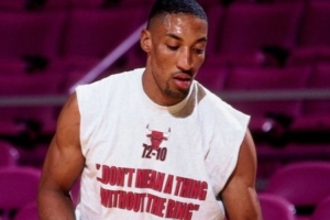 圖片中,皮蓬穿著一件紀念公牛95-96賽季常規賽取得72勝10負的運動衫,衣服上印著:沒有戒指的話,一切都沒有意義。