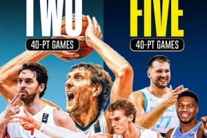 據Clutchpoints統計,1997年到2017年的10屆歐錦賽,僅出現過兩次40+,23歲的諾維茨基在2001年歐錦賽銅牌戰中爆砍43分,35歲的保羅-加索爾在2015年歐錦賽半決賽中砍下40分。最近兩屆歐錦賽(2022和2025),已經出現5次40+,東契奇2022年對陣法國砍47分,今年對陣意大利砍42分,字母哥2022年對陣烏克蘭砍下41分,馬爾卡寧2022年對陣克羅地亞砍下43分,今年對陣英國砍43分。
