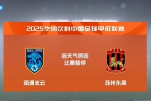 南通支云本輪中甲對(duì)陣蘇州東吳,比賽進(jìn)行到60多鐘的時(shí)候因天氣原因暫停,據(jù)南通支云官方表示,因雷暴天氣,比賽暫停。目前,場(chǎng)上比分仍是0-0平。