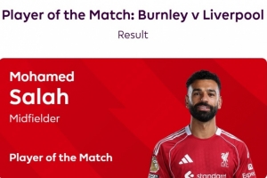 本場比賽薩拉赫在補時階段打進點球絕殺,賽后也當選英超官方球迷票選全場最佳球員。