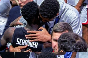 比賽賽后,同時(shí)入選最佳陣容的字母哥和施羅德?lián)肀е乱狻?duì)此,施羅德表示:“揚(yáng)尼斯做出了非常棒的舉動(dòng),他主動(dòng)來(lái)找我,說(shuō)我們各自代表德國(guó)和希臘為國(guó)征戰(zhàn),而他這次也終于為希臘隊(duì)贏得了首枚大賽獎(jiǎng)牌。我對(duì)他只有敬佩——他有四個(gè)可愛(ài)的孩子、賢惠的妻子,還有始終陪伴他的兄弟,一家人都在為籃球事業(yè)努力。更不用說(shuō)他在NBA賽場(chǎng)上的表現(xiàn),那完全是另一個(gè)級(jí)別的存在,絕對(duì)是世界頂尖球員之一。他主動(dòng)過(guò)來(lái)和我交流,這種舉動(dòng)充滿(mǎn)了體育精神,非常難得。他還說(shuō)一直在看我們球隊(duì)的YouTube視頻,我覺(jué)得這種跨國(guó)家的球員互動(dòng),對(duì)希臘和德國(guó)的籃球交流也很有意義?!?/p>