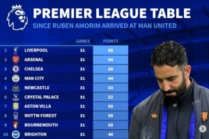 德轉(zhuǎn)列自阿莫林執(zhí)教曼聯(lián)以來各隊在英超取得的積分情況,阿莫林帶隊31輪僅取得31分,僅高于上賽季三支英超降級隊,距第1名31輪取得68分的利物浦相差37分。