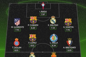 體育資訊9月16日訊 本輪西甲戰罷,數據網站Whoscored也評出本輪西甲最佳陣,具體如下:
