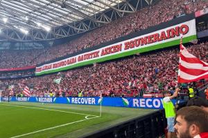 有西班牙記者曬出本場比賽畢爾巴鄂的球迷看臺,可以見到許多支持巴勒斯坦的助威旗幟和橫幅。