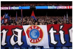 水晶宮球迷展示的橫幅將歐足聯標志中的歐洲地圖替換為歐元符號,并標有“UEFA MAFIA”(歐足聯黑手黨)字樣。