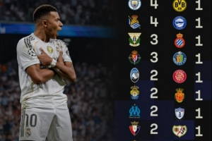 Sofascore也盤點了姆巴佩皇馬生涯50球的分布,其中對陣巴薩打進5球最多,對陣曼城、塞爾塔、皇家社會均是打進4球,對陣巴拉多利德、萊加內斯打進3球,此外對陣亞特蘭大等球隊打進2球。
