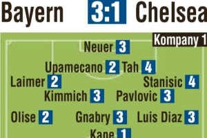 體育資訊9月18日訊 拜仁在本輪歐冠焦點戰(zhàn)3-1力克切爾西,《圖片報》在賽后為兩隊球員評分,凱恩獲評最佳1分。