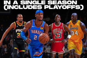 體育資訊6月10日訊 據統計,本賽季當選MVP的亞歷山大已經砍下了3000+的得分(包括常規賽與季后賽),是歷史上第四位在當選MVP賽季,做到這一點的球員。