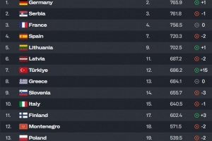 今年歐錦賽的冠亞軍排名均上升,德國男籃升至第2,力壓塞爾維亞男籃成為歐洲賽區第一,土耳其男籃狂升15位,來到第12。