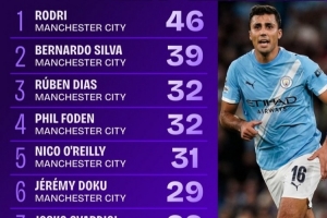 體育資訊9月19日訊 著名數據網站Squawka統計了歐冠首輪進攻三區傳球數據,羅德里46次居首,曼城球員包攬前十。