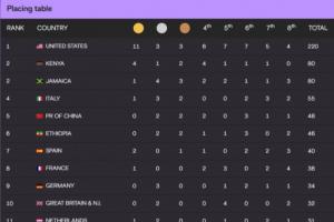 世錦賽官網更新名次得分表,奪得11金3銀3銅的美國以220分斷層領跑,4金1銀2銅的肯尼亞和1金4銀3銅的牙買加均是80分并列第2,2銀2銅的中國48分排名第5,東道主日本29分第12、韓國7分第39。