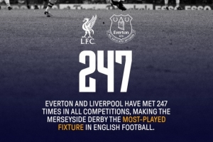 埃弗頓官方社媒曬出海報,確認埃弗頓與利物浦交手247次,是英格蘭足壇交手次數最多的球隊。