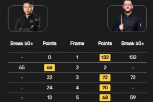 艾倫在上半場以3-1的比分進(jìn)入中場休息,又一度以5-1拉開比分優(yōu)勢,第七局周躍龍單桿81分扳回一局,第八局艾倫幾度上手完成超分,目前艾倫6-2領(lǐng)先周躍龍結(jié)束第一階段。