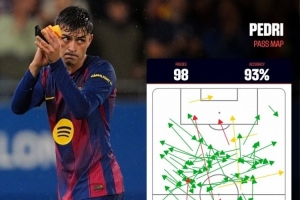 西甲官方社媒曬出佩德里此役的傳球路線圖,他傳球98次,關鍵傳球4次,傳球成功率93%。