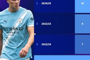 哈蘭德本賽季在前5輪英超打進6球,但這已經是他加盟曼城后前5場英超最低進球數據,他在24/25賽季同期10球,22/23賽季9球,23/24賽季則是7球。
