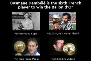 體育資訊9月23日訊 登貝萊獲得2025年金球獎,金球獎官方曬圖,這名巴黎前鋒成為歷史上第六位獲得這項榮譽的法國球員。