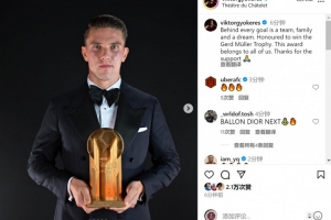 體育資訊9月24日訊 阿森納前鋒約克雷斯更新社媒動(dòng)態(tài),曬出自己與蓋德-穆勒獎(jiǎng)杯的合照。