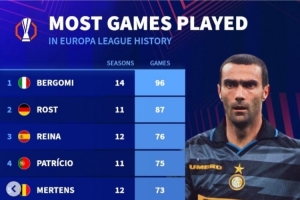 體育資訊9月25日訊 德轉(zhuǎn)統(tǒng)計了歐聯(lián)(含前身歐洲聯(lián)盟杯)球員出場數(shù)據(jù),貝爾戈米96場成為出場王,雷納、曾加位居前十。