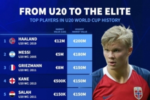 1.哈蘭德(2019年參加U20世界杯):1200萬歐元(參加U20世界杯時的身價)→2億歐元(生涯迄今最高身價)